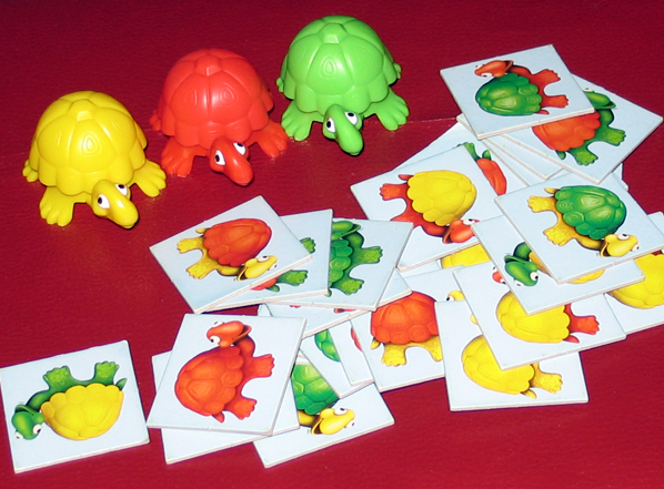 Поставьте черепашек в центр стола и нарядите их в панцири любого цвета. Перемешайте карточки с черепахами и положите их картинкой вниз на столе. Игру начинает самый младший игрок. Он берет одну карточку и сравнивает ее с черепахами на столе. Если у одной черепашки присутствует такая комбинация цветов как на карточке, игрок забирает эту карточку себе. Если нет - кладет карточку обратно в колоду. Затем игрок меняет панцири у 2 или 3 черепашек. После этого ход переходит к другому игроку. Игра окончена, если один из игроков собрал: 4 карточки при игре 4 человек, 5 карточек при игре 3 человек, 6 карточек при игре 2 человек..Эта простая и веселая игра очень нравится детям и украсит любой детский праздник.