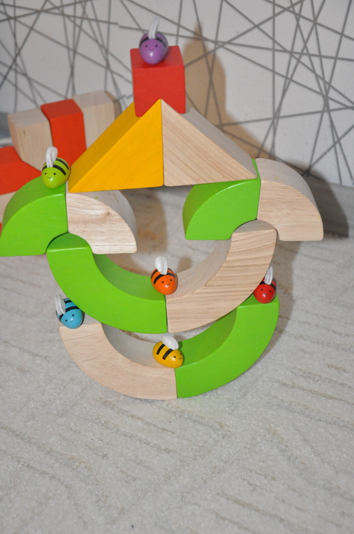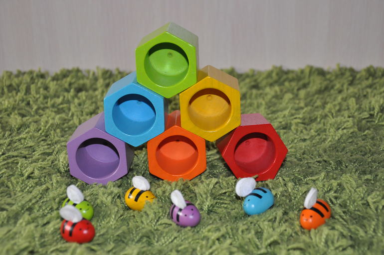 Всем известные "Пчелки")) Коробка у нас, к сожалению, не сохранилась, но по размеру, насколько я помню она чуть поменьше той, что от мозаики Plan Toys, о которой мы вот тут рассказывали.
