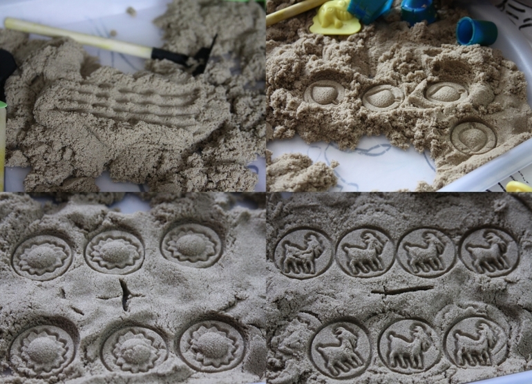 На песочке замечательно штампуется - формочки от обычной массы для лепки. Сначала можно просто поиграть, повырезать полученные фигурки. А потом можно и примеры порешать :)