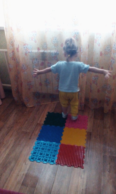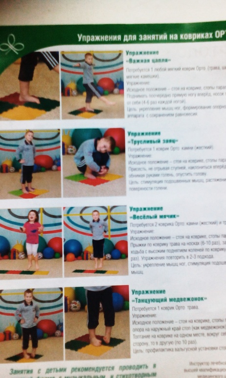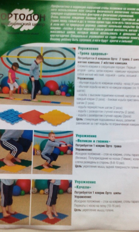 Очень полезно хождение босиком по естественным грунтовым дорожкам (траве, песку, гальке и др.) в теплое время года, если есть такая возможность. А если нет, то природную дорожку заменит напольное покрытие Орто – это коврики- «пазлы» в виде морской гальки разной жесткости, мягкой травки и массажных шипов, которые можно использовать в домашних условиях круглогодично.