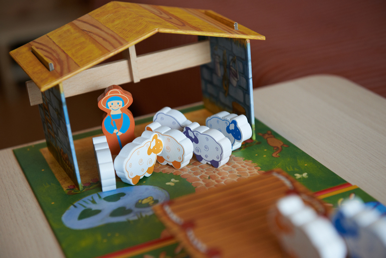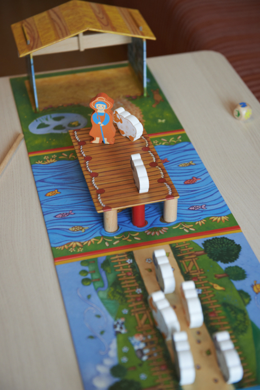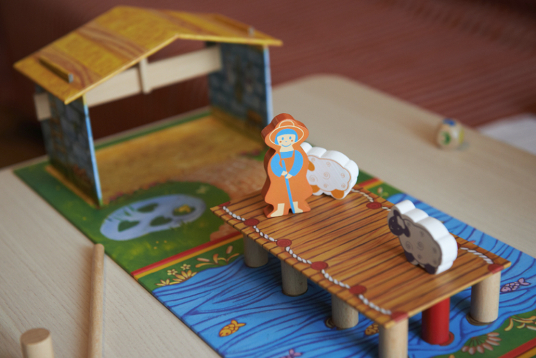 Размер коробки внушительный, но не очень большой. Для хранения нормально, можно найти место. (а с этим последнее время беда). Открываем. Внутри игровые площадки, детали для моста и овчарни, фигурки и инструкция. Все очень хорошего качества! Картон очень приятный на ощупь. Деревянные фигурки сделаны тоже хорошо. Теперь собственно о процессе. У нас он начинается уже на стадии сбора игрового поля. Ребенку очень нравится и мостик собирать, и овечек расставлять ( еще и разберет по цветам, какие одинаковые, какие нет). Далее самое интересное. Необходимо перевести всех овец с луга в овчарню. Правила очень простые и понятные. Поэтому будут ясны даже маленьким детям. Возрастная группа указана с 4 лет, но я думаю, что и 3-летки осилят. Ход определяет картинка, выпавшая на кубике. Замечу, что мой ребенок пытается уже кинуть так, чтобы не выпал ветер, при котором убирается одна опора моста. Но тут, как ни старайся, а ветер на пути попадается. ) Конечно, успех в игре зависит не только от удачи (что выпадает), но и от слаженной работы команды. Ребенок решает вопросы логистики( куда, кого и когда). Мы играем с удовольствием и почти каждый вечер. Жалею только об одном. Что не было у меня этой игры, когда рос старший ребенок. У него был комплекс проигравшего, играть было просто невозможно. А здесь сообща и выигрывать веселее и проигрывать не так обидно. Ну и фотографии всего процесса.)