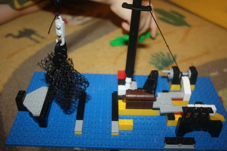 До конца собрали один раз по картинке и Дима пошел корабль запускать в ванную... но он потерпел кораблекрушение тут же )) больше целиком не собирали, но вот сами пираты, мечи, штука, которая крутится - поднимает сетку, сама сетка, крокодил - все это востребовано ))) А корабль надо вместе садиться