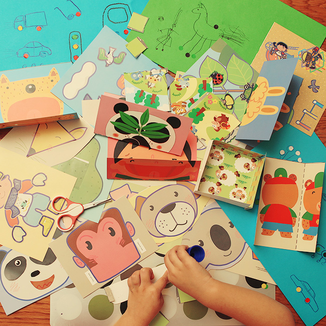 Наклейки. Знаю, сейчас выпускают очень много разных альбомов с наклейками. Никакой креативности они не развивают фактически, зато моторику, координацию и глазомер отрабатывают просто отлично. У нас расходуются как носки.