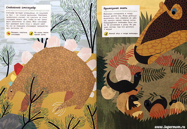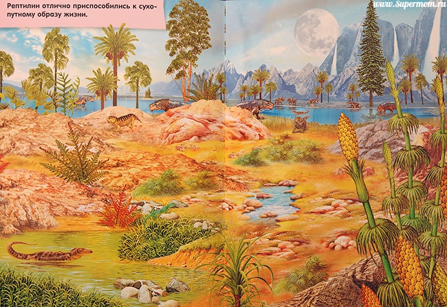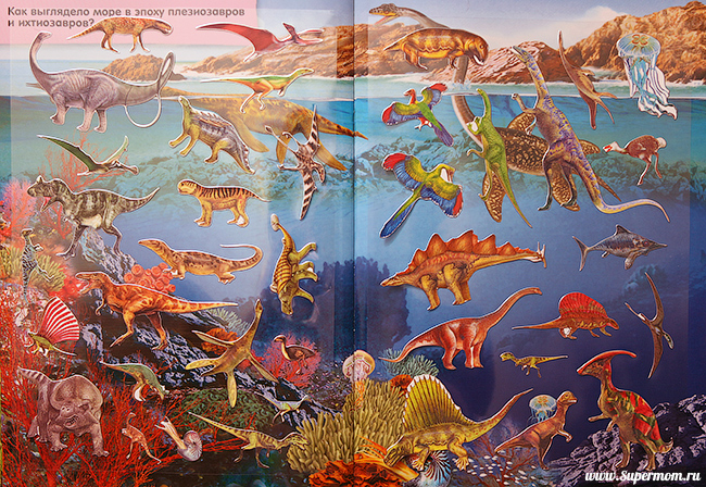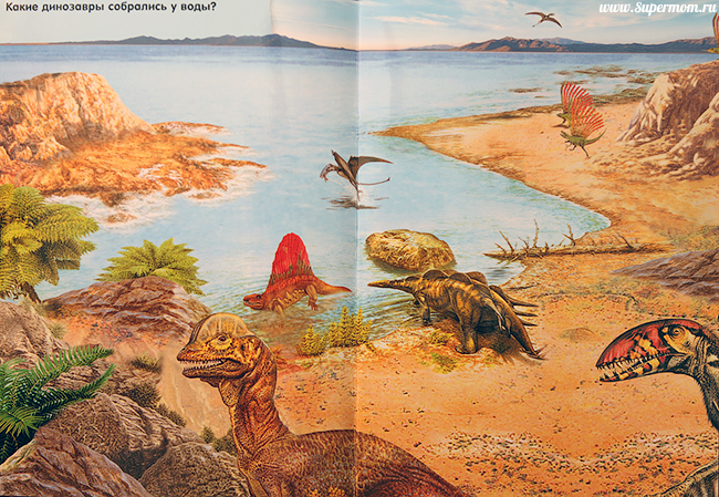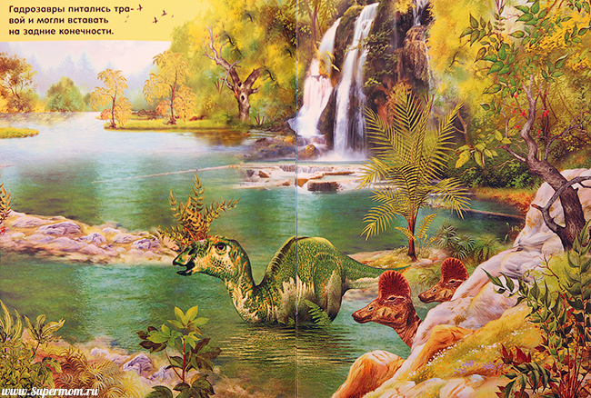 На волне увлечения динозаврами очень радостно был воспринят этот альбом. Иллюстрации просто отменные, все проработано до деталей, на разворотах целые картины: