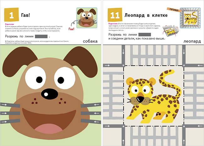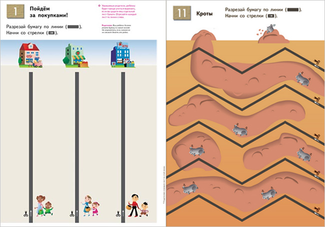 Все очень похоже, но только формат альбомов больше - А4. В этой серии упор идет на постановку руки: провести линию, пройти лабиринт. Недавно появился еще один альбом с вырезанием, он очень похож на тот, что я описывала в предыдущей серии, но рисунки другие, что очень нас обрадовало.