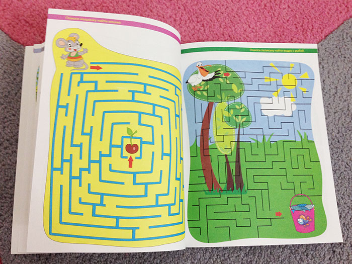"" ("Феникс"), 262 рубля. Книжечка толстая 64 листа (128 разных лабиринтов), взяла ее в дополнение к кумоновским "Увлекательным лабиринтам", но придется отложить на год-другой. Лабиринты там довольно сложные, трехлетки точно не осилят. А в остальном вполне себе неплохо.