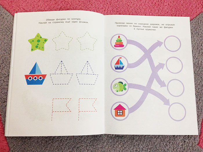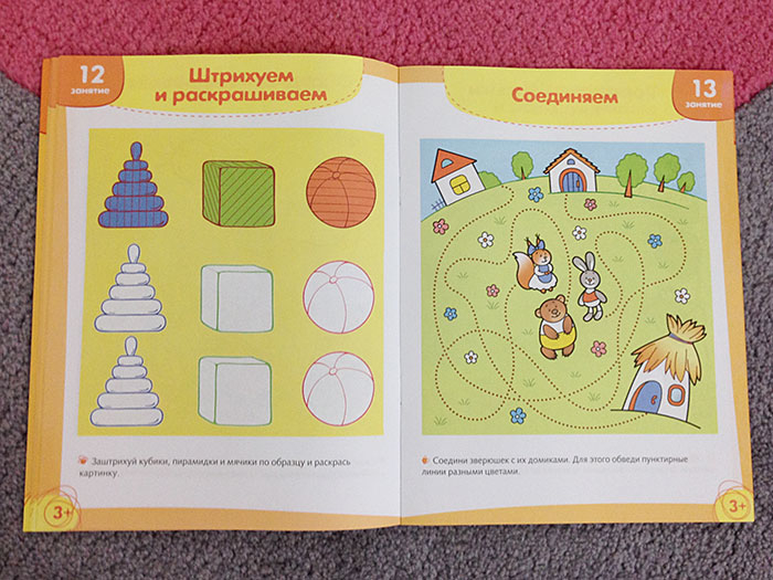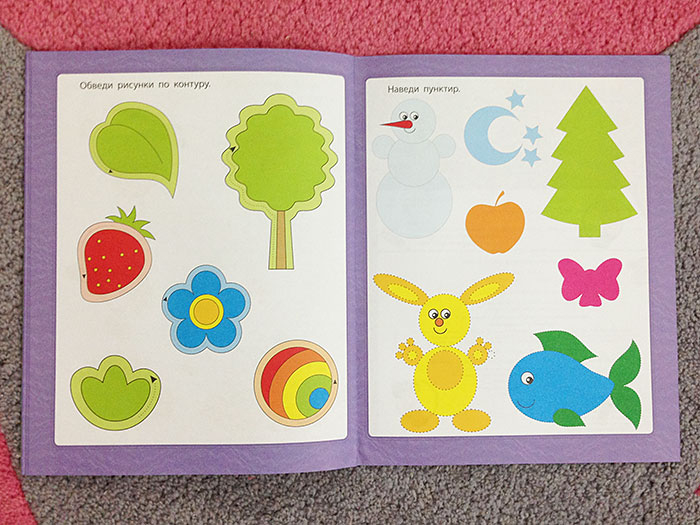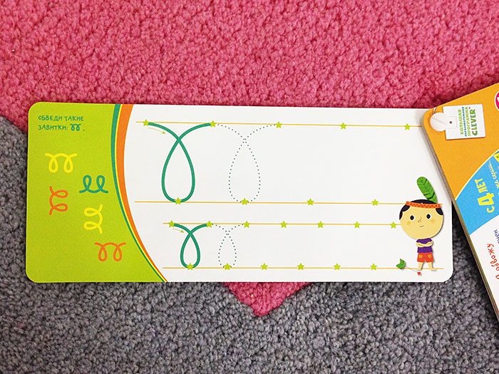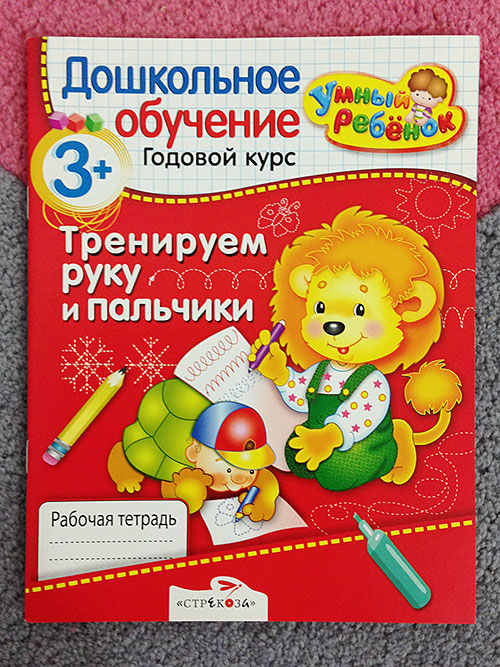 Сами задания не на наш возраст. Пособие напоминает обычные школьные прописи, только вместо букв - разнообразные закорючки. Сильно сомневаюсь, что трехлетки будут эти закорючки обводить, ну не интересно им это. Еще зачем-то авторы пособия приплели сюда изучение цветов и фигур. Судя по заданиям, они рассчитаны на 5-6 лет, в этом-то возрасте дети уже и цвета и фигуры знают.