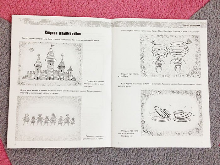 "" ("Феникс"), 136 руб. Листов непосредственно с заданиями - 26. Еще одно пособие на тему каляк, но уже российского автора. Подход довольно интересный: вся книга - одна большая история про страну Калямалякию и ее обитателей, которых и предлагается раскрасить. Между делом встречаются несложные задания на счет, например. Ближе к концу пособия появляются полностью самостоятельные задания.