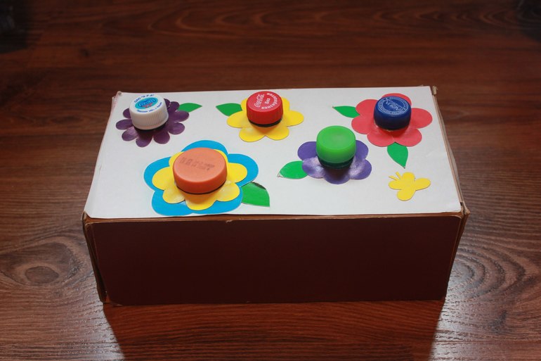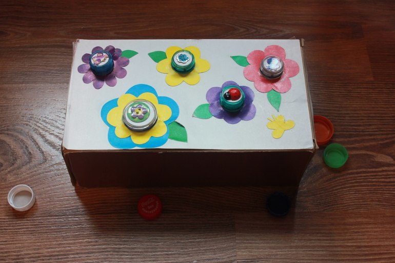 Одно время особую страсть Саша испытывала к различным бутылкам: откручивать - закручивать крышечки - любимое дело)Так родилась она - простенькая, но оочень занимательная вещ! Ненужную коробку обклеила цветным картоном, вырезала отверстия, вставила и приклеила горлышки. Под крышки наклеила сюрпризики для большего интереса. Саша была от неё в восторге!