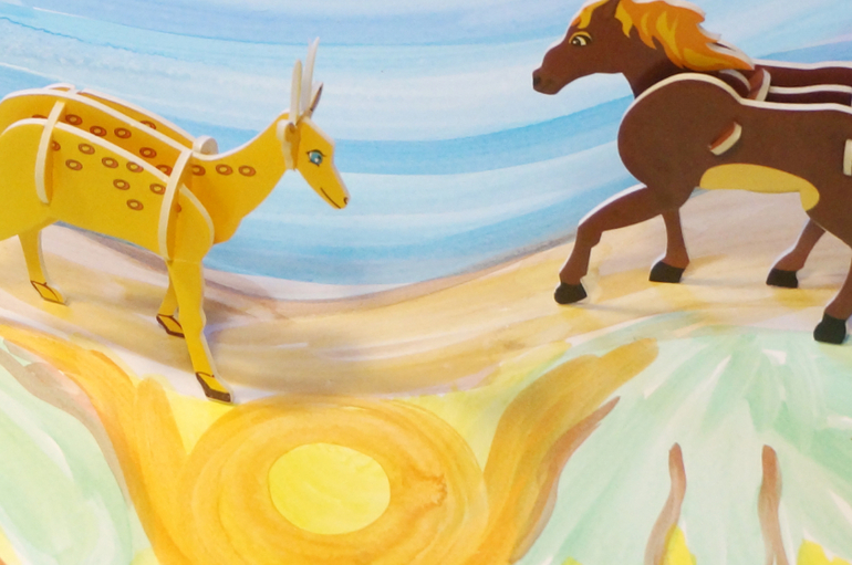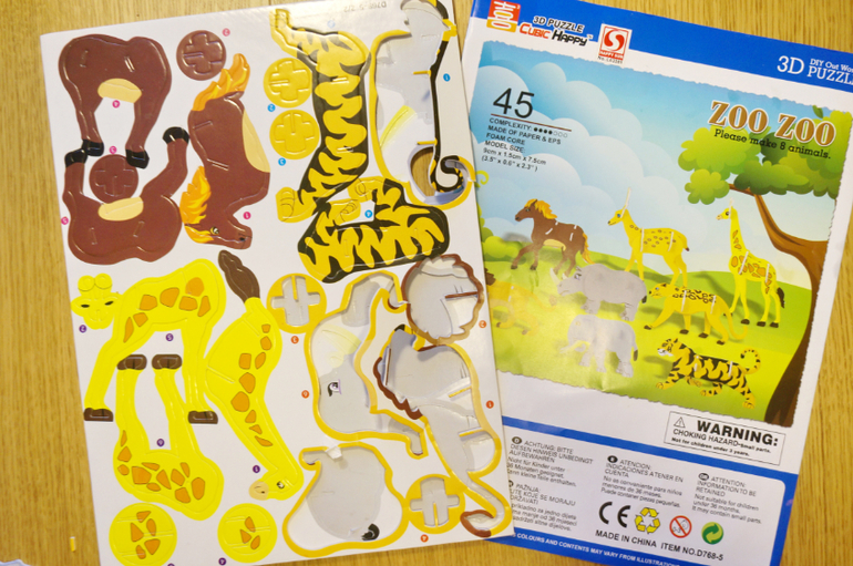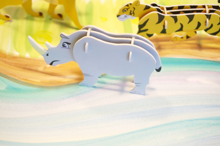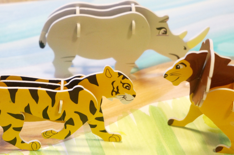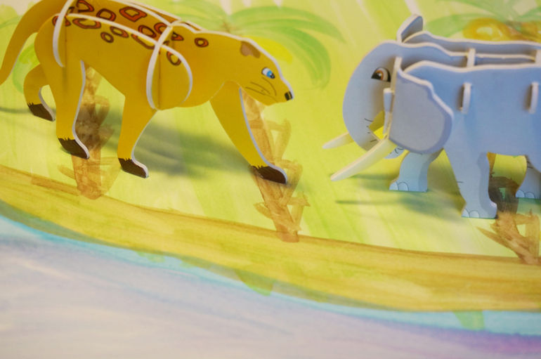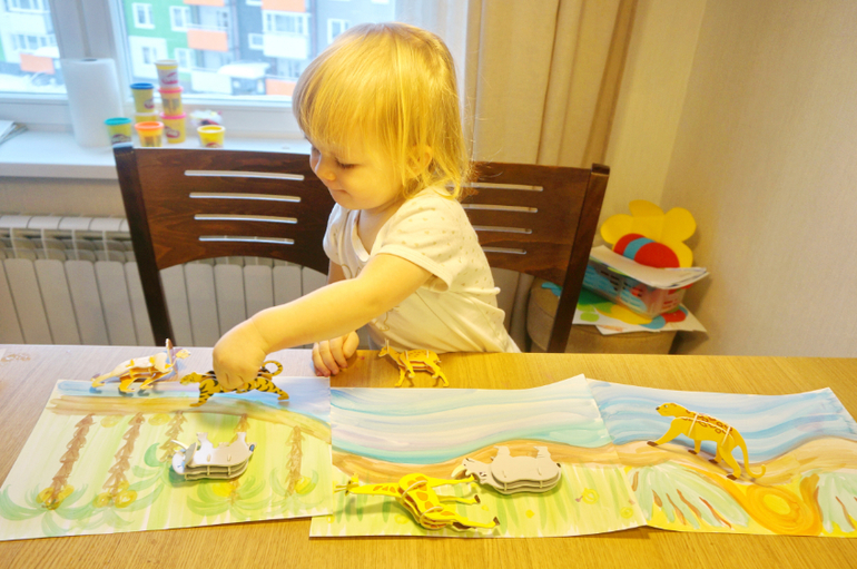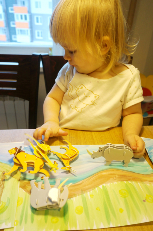 Развивающие игрушки (пазлы, вкладыши, конструкторы, мозаики)Недавно нам подарили 3Д пазл про животных, который как-то долго валялся без дела. Я решила собрать 1 животное, и вовлеклась в процесс вместе с Машей. Приятно, что довольно недорогое изделие (около 250руб.) отлично вынималось, складывалось, получалось! Фигурки довольно реалистичные и устойчивые, но к ним быстро пропадает интерес после сборки без определенного контекста. Мы взяли акварель и стали рисовать им среду обитания, реку, пальмы с кокосами и бананами, дорогу, оранжевый закат. Сразу появилось настроение, сюжет, ролевая игра, новые слова и понятия! Потом мы принесли друзей Лего и сравнивали, кто кому родственник! Фигурки до сих пор живы и стоят в сторонке, Маша к ним иногда забегает! А у вас какие интересные находки на почве пазлов?
