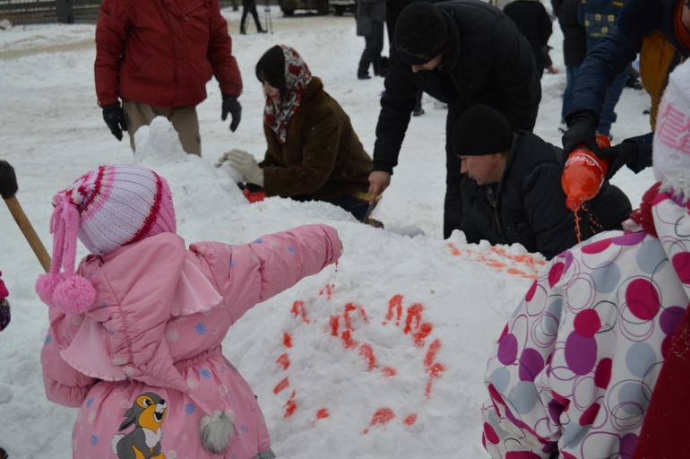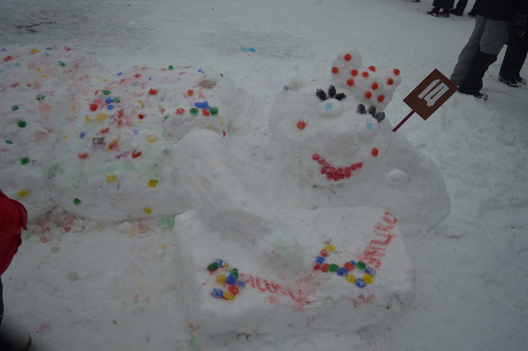 Разное (если затрудняетесь с выбором)Вы любите лепить снеговиков? Анютка вот очень любит и еще в понедельник сказала на с папой, что в выходные мы пойдем лепить большооого снеговика. ( маленьких-то мы периодически лепим, хоть снег и не очень давал это сделать). Как оказалось, что как раз в субботу в городском парке проходит конкурс снеговиков. Ну вот мы всей семьей и дети с родителями из нашего центра лепили девочку с книгой. Мы рисовали из бутылок с краской, украшали снежную скульптуру "Бриллиантами" (цветными льдинками), а также бриллианты знаний сыпались из книги.