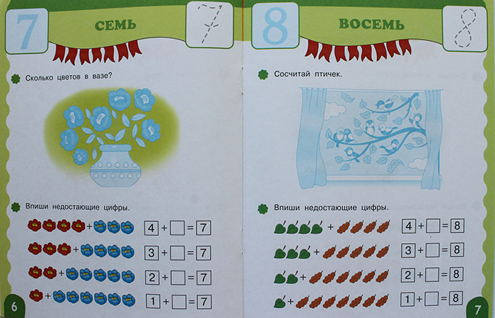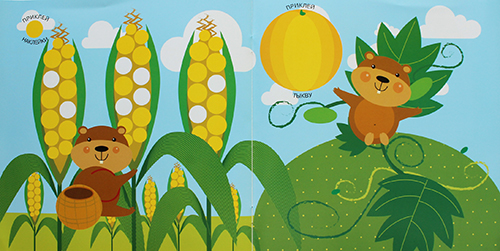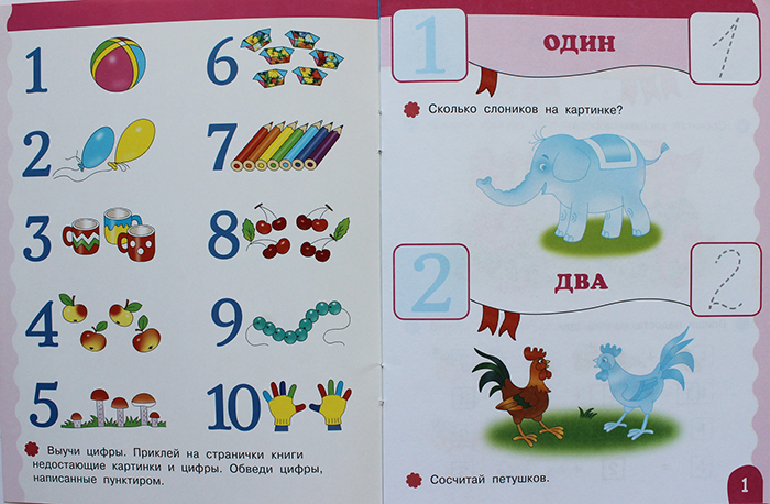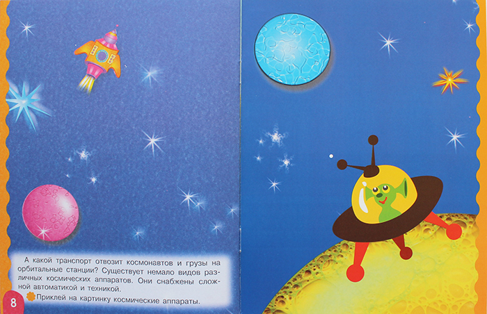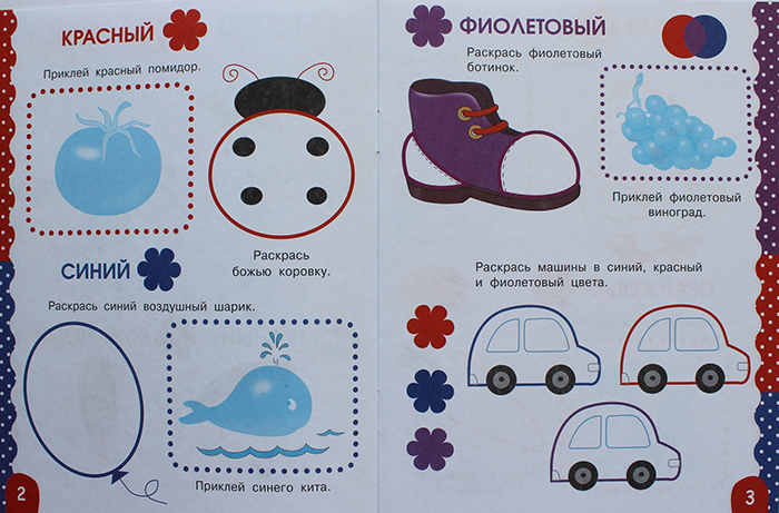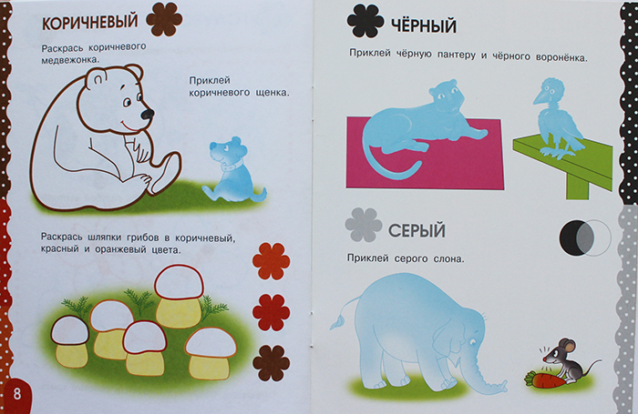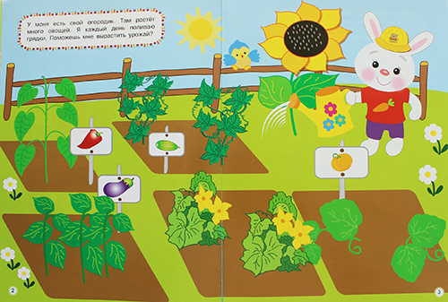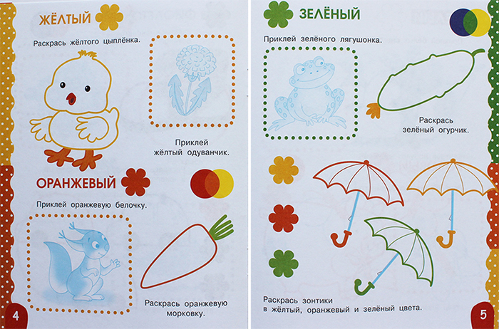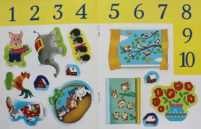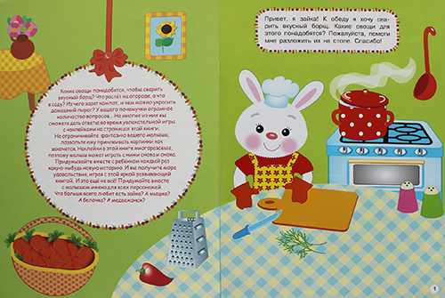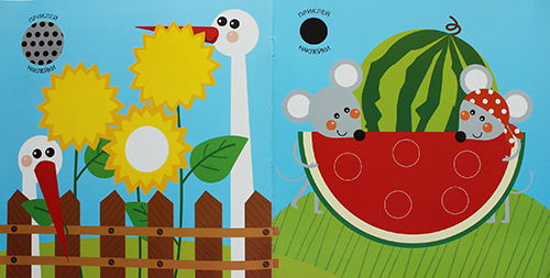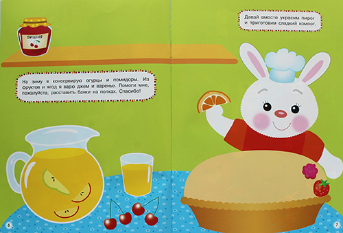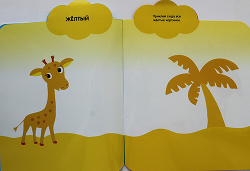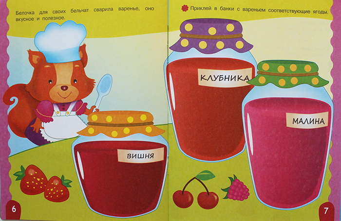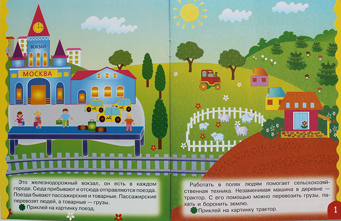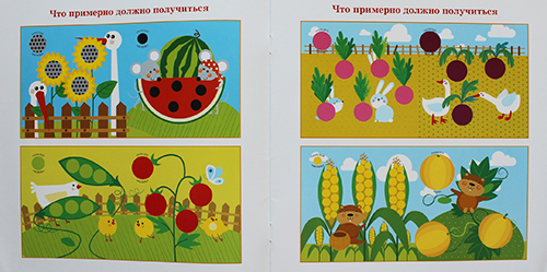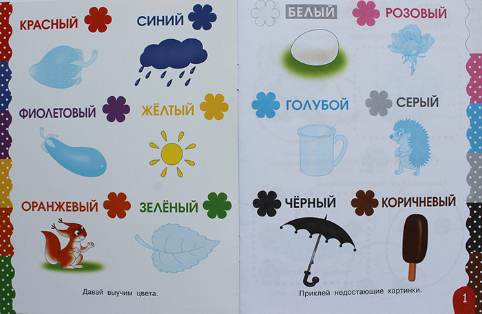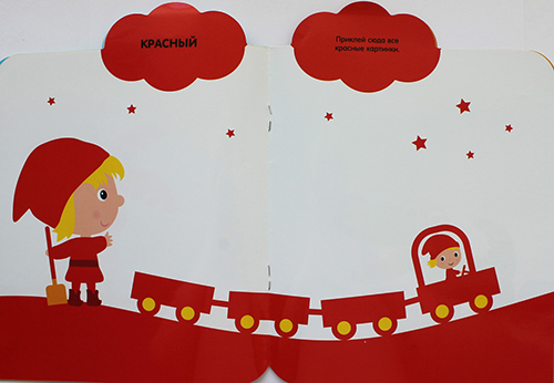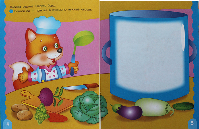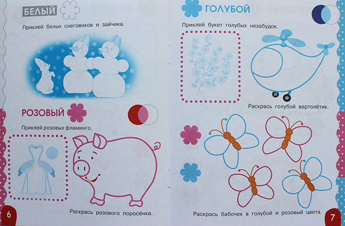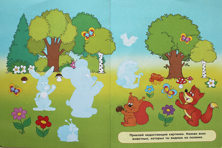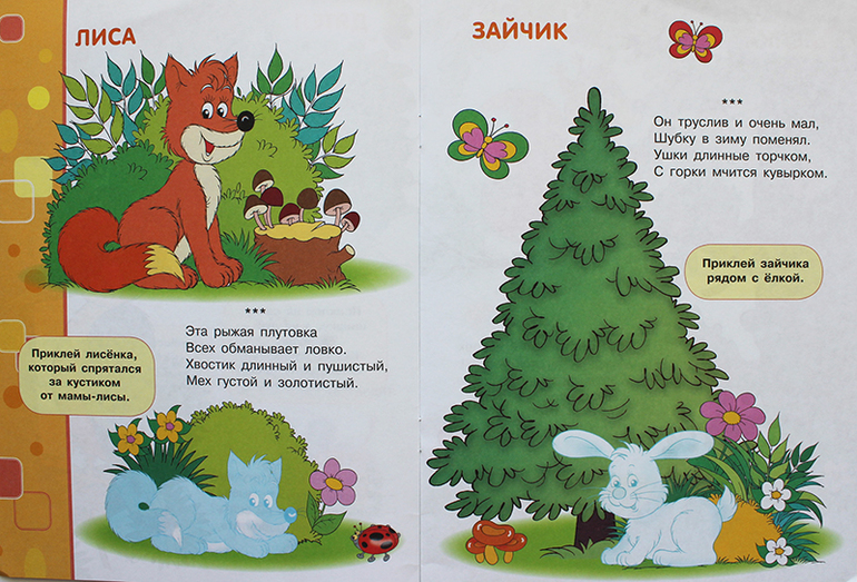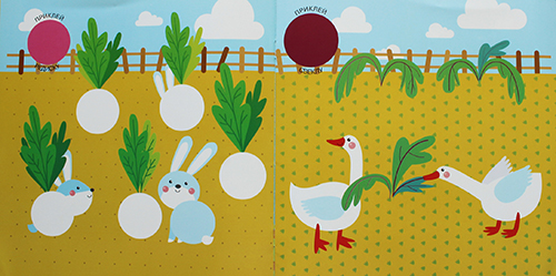 Ну тут все очень просто. На первой странице показаны развороты, как все должно выглядеть -подсказка для родителей. Но и без этих подсказок и так все понятно, т.к. на каждой странице к заданию так же естьподсказка, что нужно приклеить.