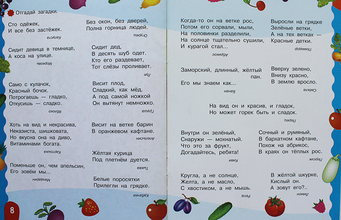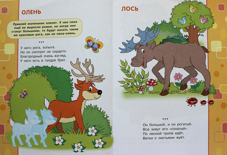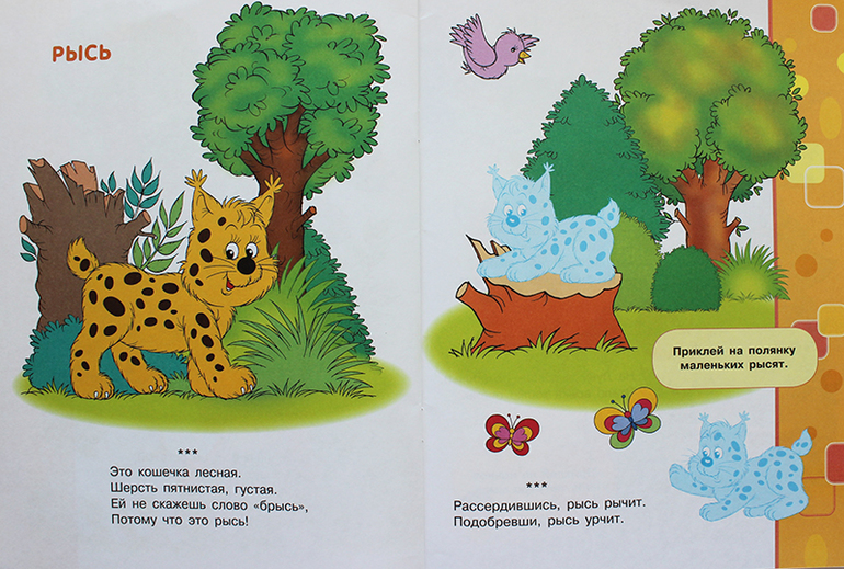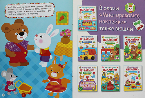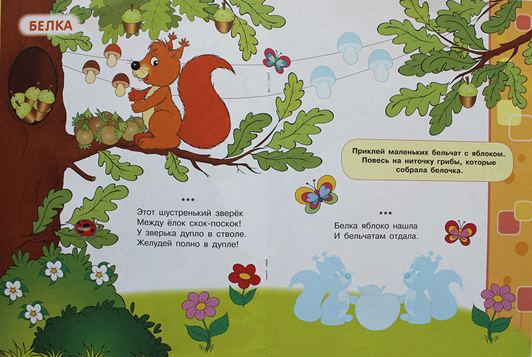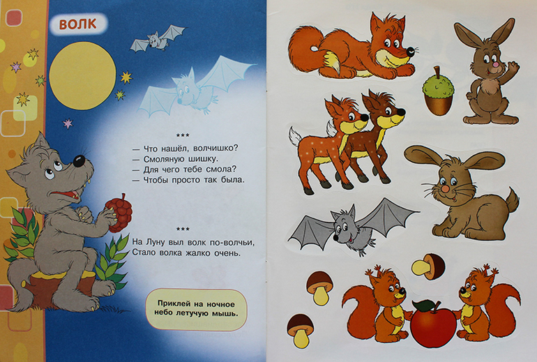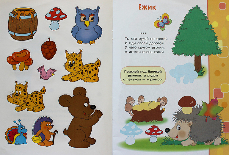 Очень классная, яркая, много животных, есть задания на каждой страничке (приклеить совёнка к маме, помочь белочке развесить грибочки и т.д- каждый ребенок, думаю, с большим удовольствием поможет зверюшкам), можно повторить, кто что ест, так же есть скороговорки и загадки и конечно же стихи. Но естьбольшое НО!!! Наклейки одноразовые! Они реально очень сильные и отклеить не получится даже самым аккуратным способом. Но даже приклеив все наклейки, думаю, вы будете ее перечитывать вновь и вновь (как мы).