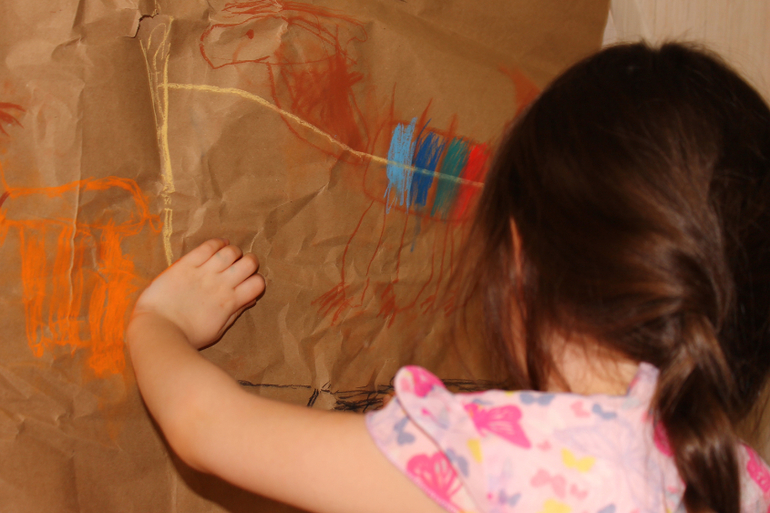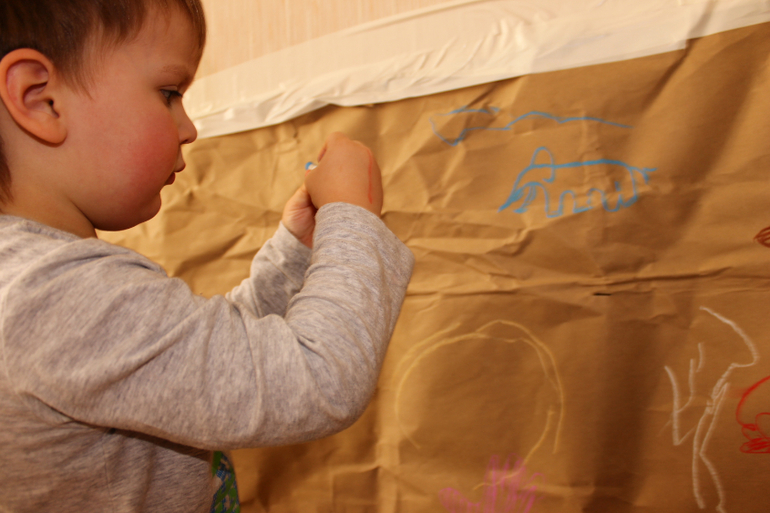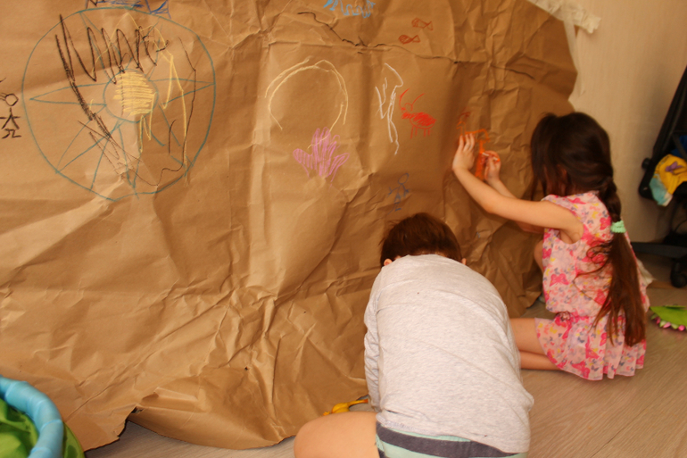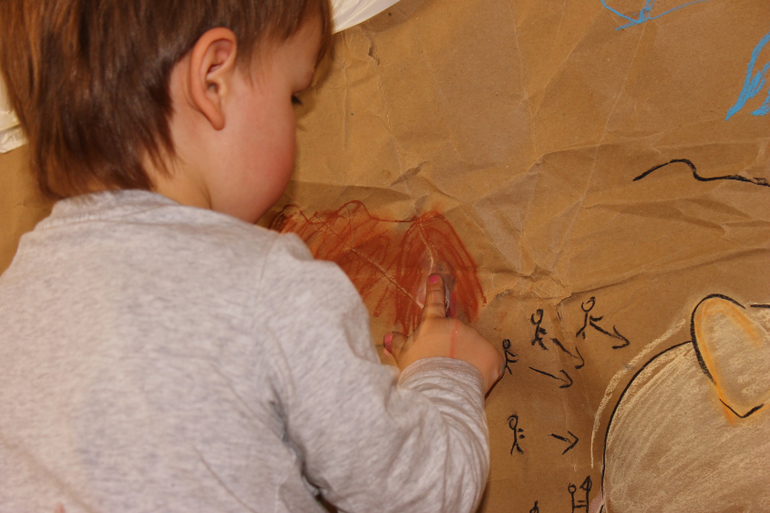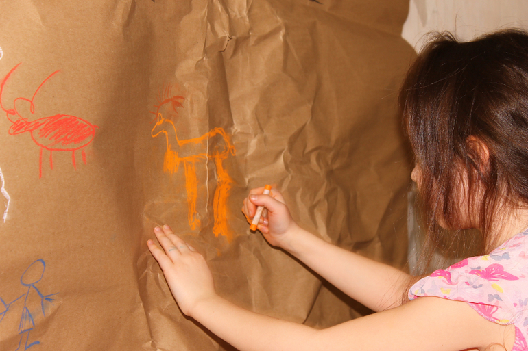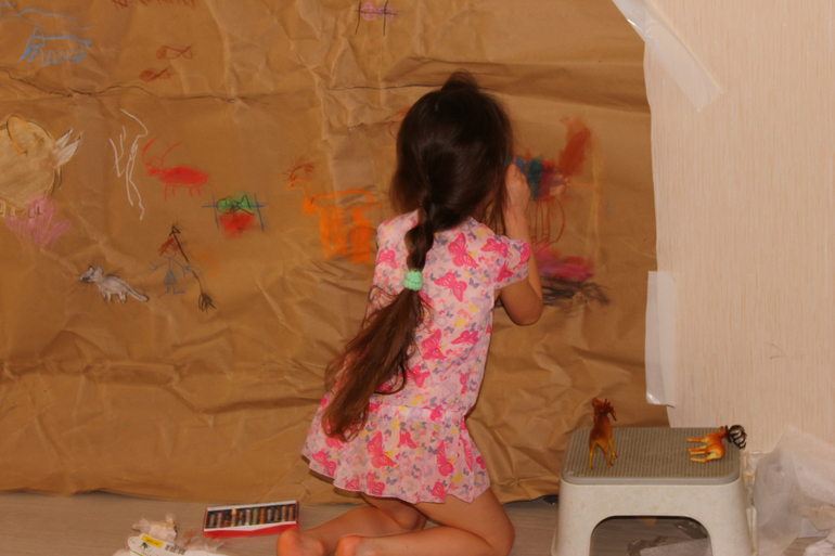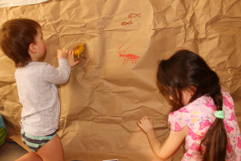Рисовали вымерших животных. Досталось и животным существующим.На стенах нашей "пещеры", есть изображение нашей кошки. Только изображена она пылающая на костре. Добрые дети,да.