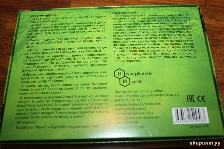 Правила игры на обратной стороне коробки, предложено три варианта. С совсем маленькими детками можно просто подбирать одинаковые карточки, рассматривать, обсуждать.