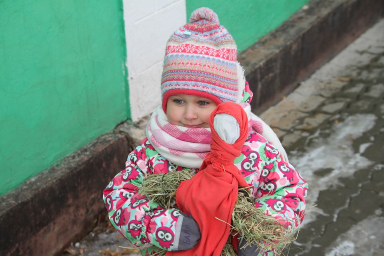Побегали с обручем. Сначала хотели в масленичные игры поиграть, но после нескольких неудачных попыток, просто отдали детям обруч и они бегали туда-сюда, внутри обруча и снаружи, кричали, что они лошадки.