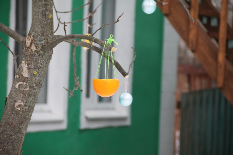 Настряпавшись, приступили к изготовлению кормушек, решили, что и нам нужно птичек призвать, чтоб они Весну привели. Срезали треть апельсина, очистили внутри, продели верёвочки и заполнили кормом для диких птиц.