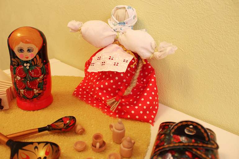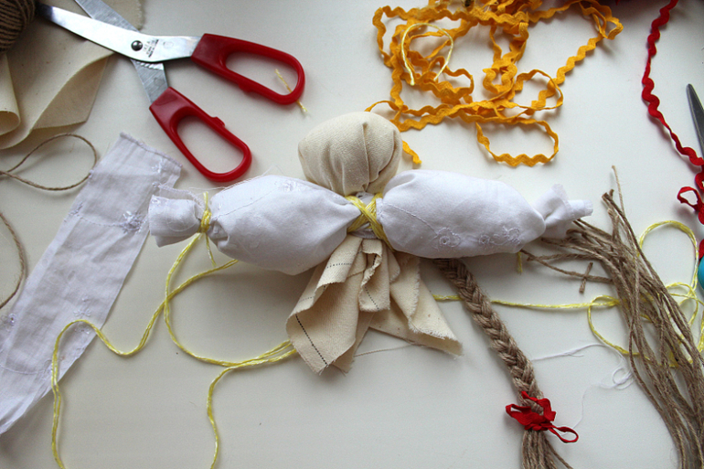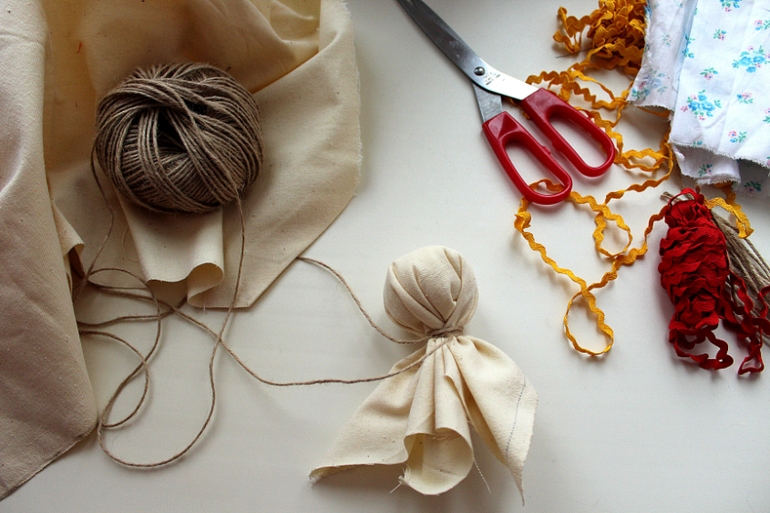 И хотим показать, как сделать традиционную русскую куколку-мотанку из остатков ткани, веревок и ленточек.