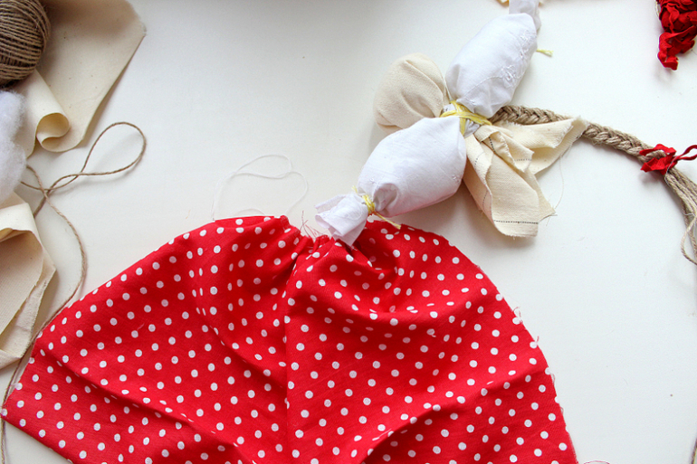 2. Делаем голову - вырезаем квадрат телесной ткани, наполняем его синтепоном и связываем веревкой. Этой же веревкой закрепляем косу. Не нужно стремиться к аккуратности, узелки будут спрятаны под платок.