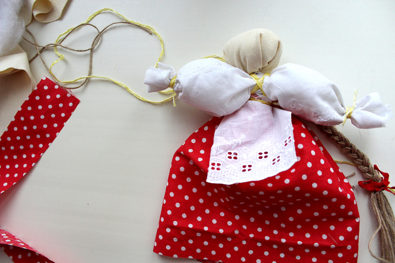 5. Завязываем на голове платочек, украшаем по желанию тесемками и куколка на масленицу готова!