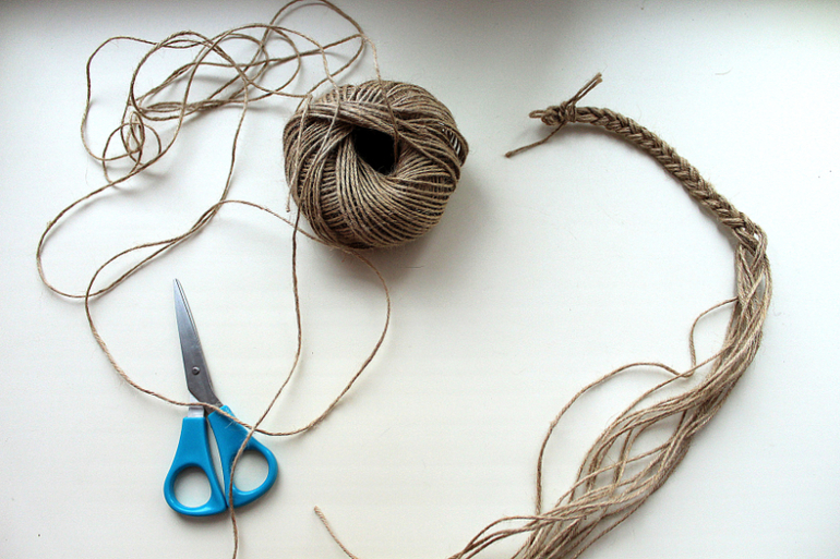 1. Плетем косу из бечевки нужной длины, закрепляем тесемкой