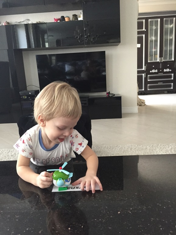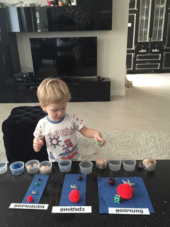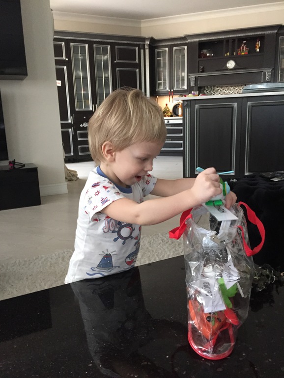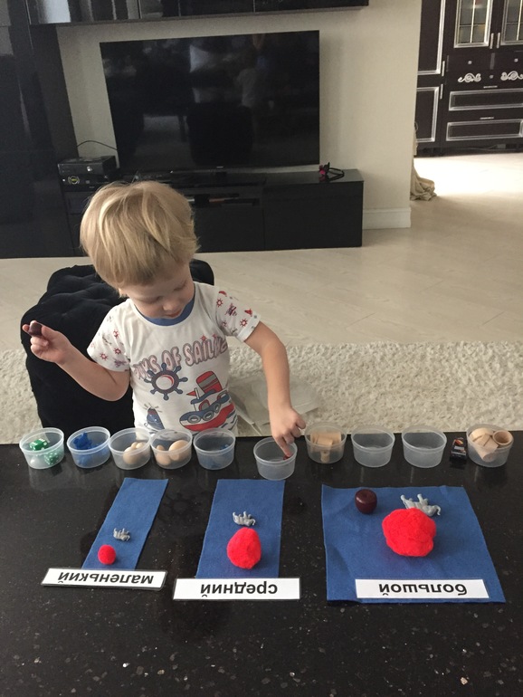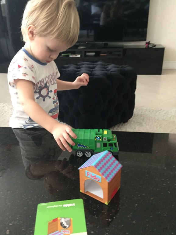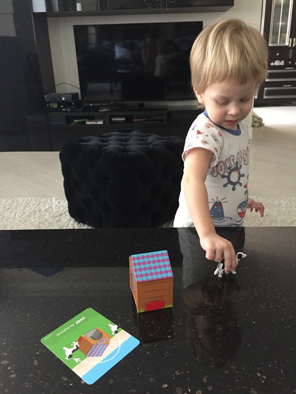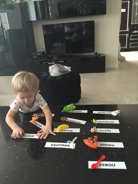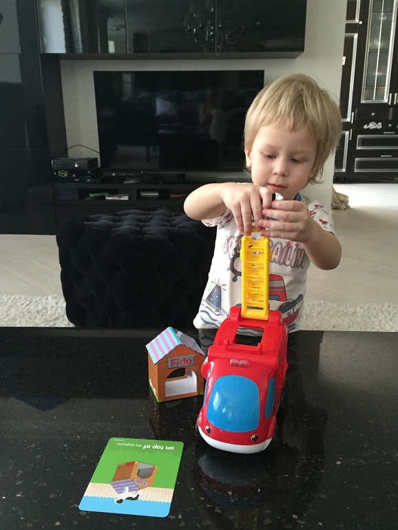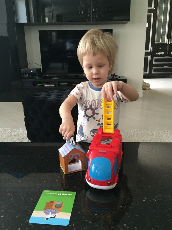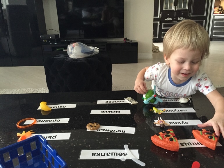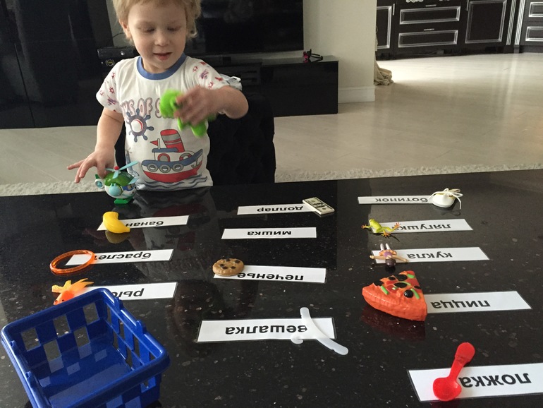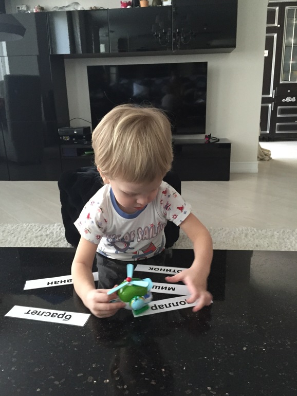 а потом вертолетик относил все слова и карточки обратно в сумочку, я называла слово и Степа безошибочно забирал вертолетиком нужную карточку, не знаю читает или нет, мы в эту игру играем часто, может просто запомнил визуально