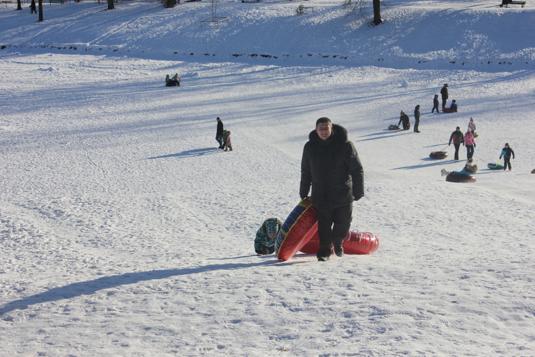 Ватрушки у нас с собой не было (она катается у папочки в машине) и Славик катался на ледянке и кстати ничуть не хуже...