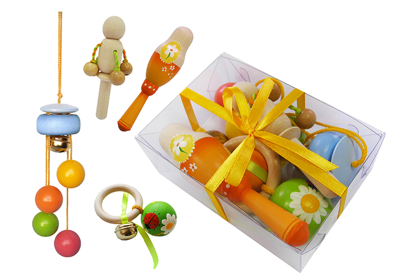 Погремушки с бубенцом изготавливаются из натурального дерева, если неокрашенная погремушка, то это обычно древесина бука, она хорошо отшлифовывается и не тяжелая, к такой погремушке добавляется бубенчик для мелодичного звона. На Руси погремушки с бубенчиками использовали как первую игрушку для развития слуха малыша. Звон такой погремушки благоприятно воздействует на сенсорное восприятие младенца.