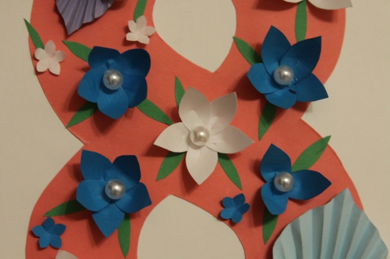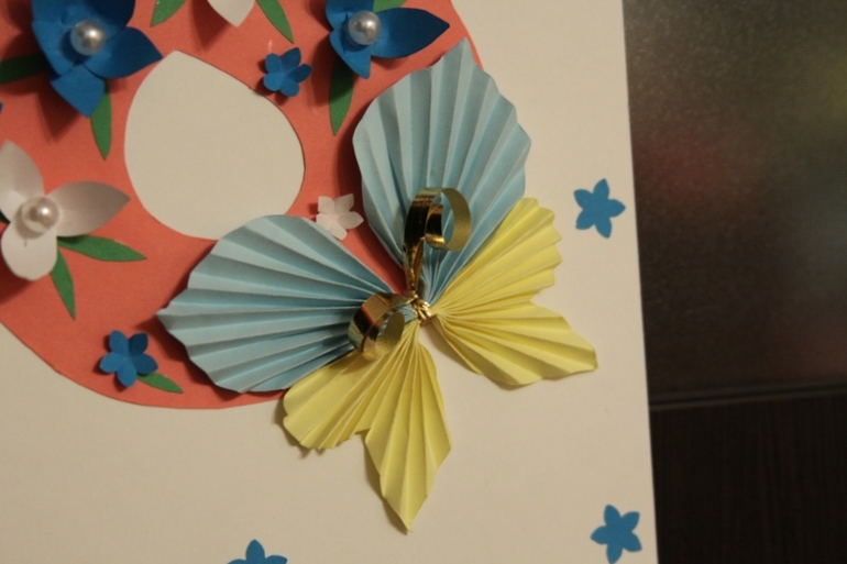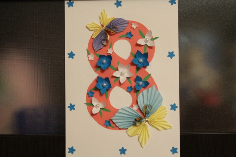 Трудились все - и папу подключили :) Соня обвела по шаблону и вырезала восьмерку (с внутренними частями я помогла), по шаблону вырезала крылья бабочек и несколько лепестков (остальные лепестки папа вырезал), дырокол конечно был в руках у Сони :) Я складывала бабочек, потому что так меленько сложить даже у меня не очень-то с первого раза получилось. А в это время папа с Соней собирали и склеивали цветочки :)