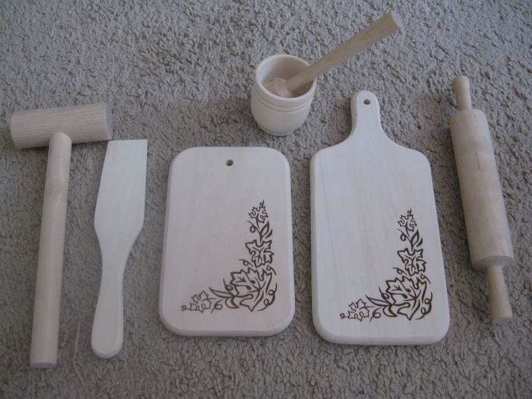 2. Деревянная утварь - отличные наборчики, все как настоящее только в миниатюре, дочь использует все на кухне, когда помогает мне готовить! На деревянной доске можно резать, в ступке толочь специи, сахар, а скалкой раскатывать тесто (или пластилин)