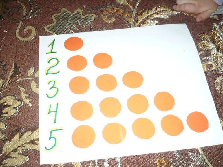 4. Теперь эти колобки нужно разложить по кружочкам. Учим цифры, считаем. Это занятие Соню совсем не заинтересовало. Положила пару шариков и все. Продолжала возиться с палстилином. Говорила что она крутит фарш)