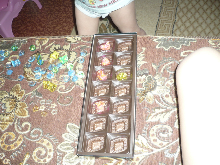 1. Разложить камушки по ячейкам от коробки конфет. В одну ячейку - один камушек. Дочке это занятие нравится, она вообще любит возиться с камушками.
