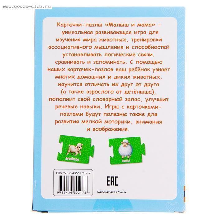 Мы начали освоение с домашних животных. для 2 лет тяжеловато, например, мама - овца, малыш - ягненок. Для нашего возраста адаптировали и играли следующим образом. Искали маму и малыша просто по картинкам, не называя по названию. То есть называла я малыша, Соня называла как они говорят. Нашли пару друг другу и она мне рассказывала как они говорят. Пока играем так. С дикими животными просто познакомились, но нам еще тяжело их запомнить. Только волк запомнился. Игру такую советую. Карточки прочные, не ломаются и не мнутся. Еще и надо их вставлять друг в друга как пазлы.