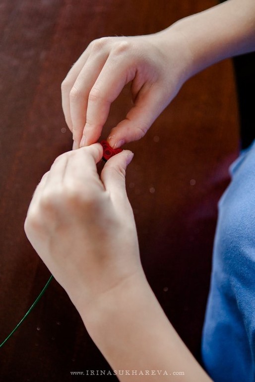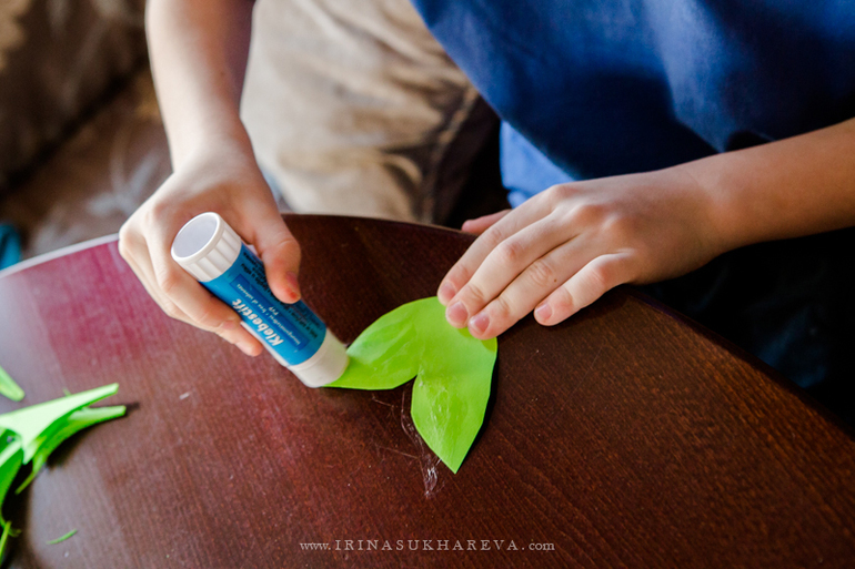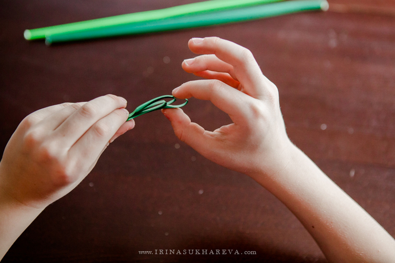 Потом приступили к сборке цветов. Склеили полоски стеблей друг с другом, оставив с одного края небольшой зазор примерно в пять миллиметров.