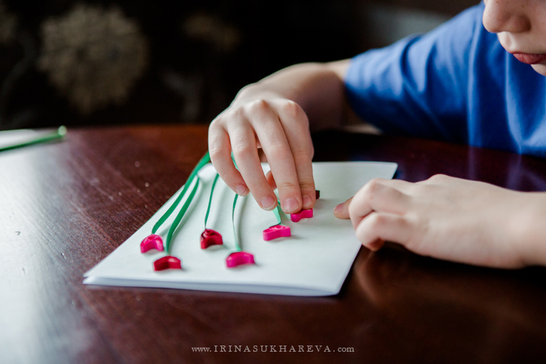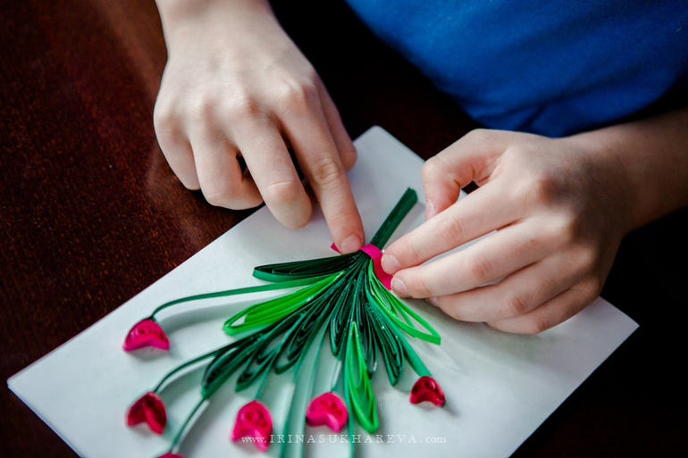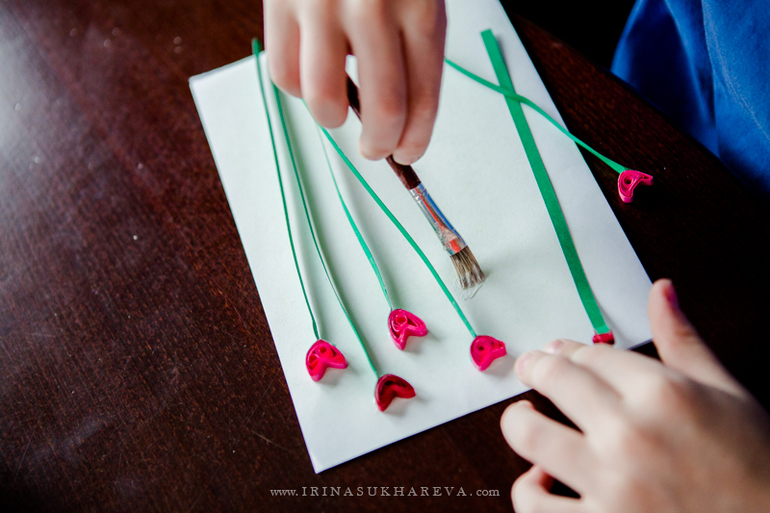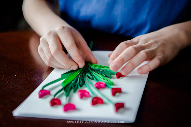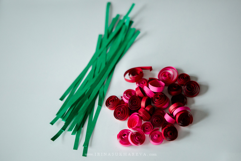 Для этого мы использовали белый картон, зеленую, розовую и бордовую бумагу для квиллинга, клей ПВА, ножницы. Вначале нужно было сделать заготовки для наших будущих цветов. Для этого мы нарезали полоски зеленой бумаги пополам, чтобы сделать стебли тюльпанов, и скрутили спиральки из розовых и бордовых полосок для бутонов.