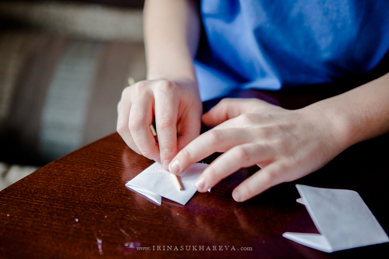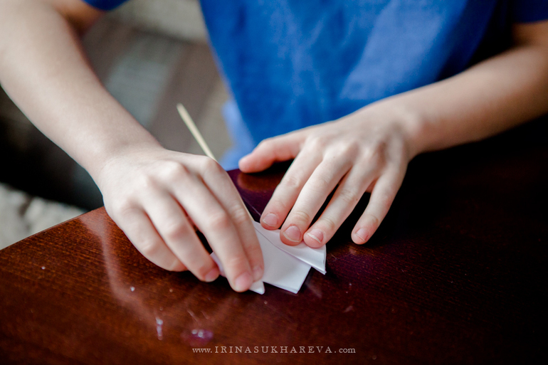 Получившуюся заготовку сжали с одного края, придав листу остроконечную форму.
