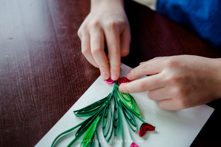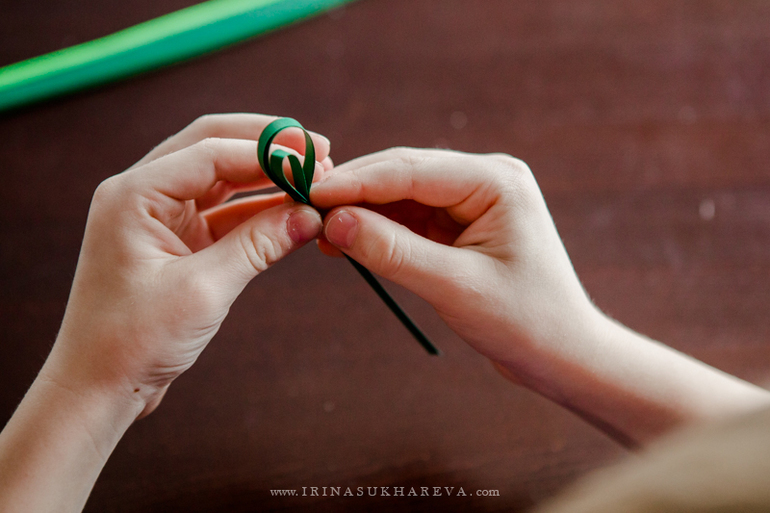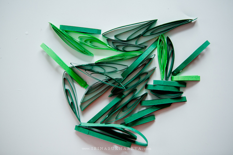 Для листьев зеленые полоски сложили петелькой, наматывая каждую следующую чуть большим размером с расстоянием примерно 3-4мм. Когда полоска заканчивается, ее можно обрезать или подкрутить оставшийся кусочек внутрь.