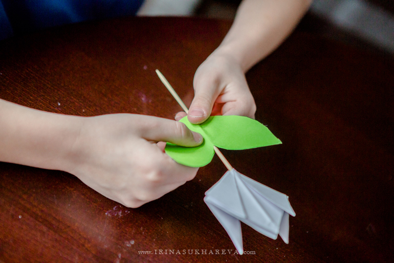 Затем вырезали из зеленой бумаги листья. И приклеили их таким же способом к палочке.