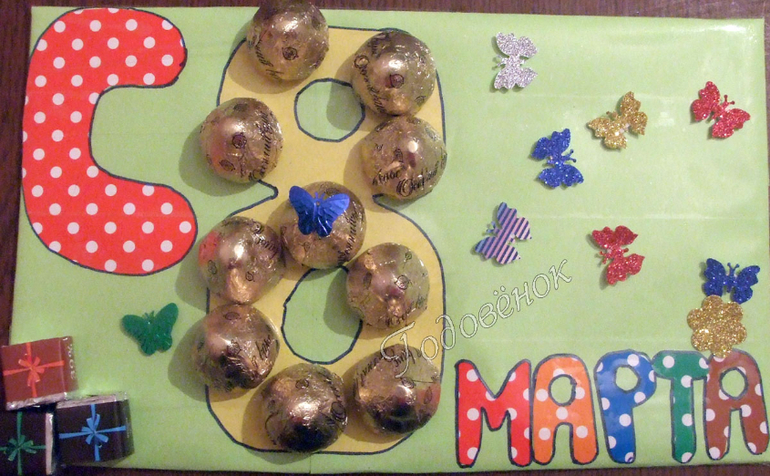 Цифру 8 выложили конфетами "осенний вальс", в левом нижнем углу - "подарки", это тоже конфеты.