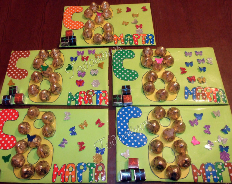 Открытки делали так: лист картона (от обычной коробки) я оборачивала цветной бумагой и выдавала детям. В одном случае печатала слова "С 8 марта", в другом - вырезали из цветной бумаги с кружочками. Ну а дальше - полет фантазии :)