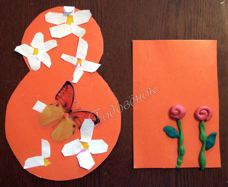 А это поделки детей мне на праздник из садика. Что интересно, у всех детей в группе были разного цвета бумаги-основания поделок. А моим обоим детям достались листы оранжевого цвета. Хотя дети не только в разных группах, но и в разных садиках :)