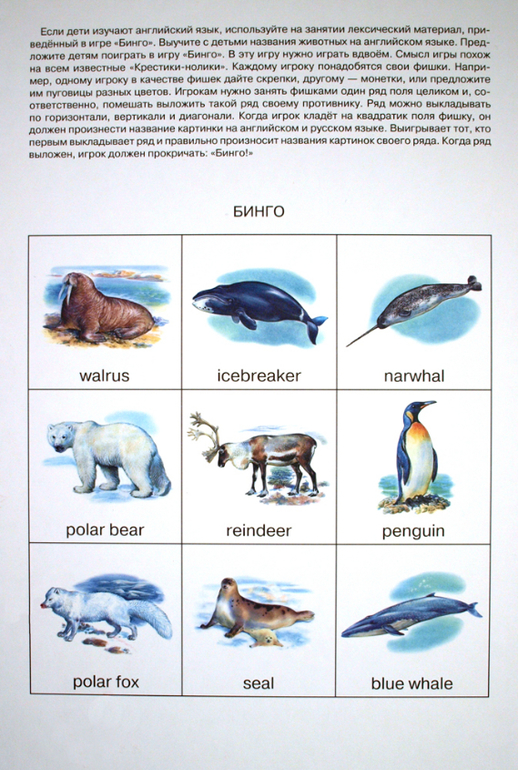 В наборе «Животные Арктики и Антарктики» та же структура. Но на английском даны только названия животных. Игра «Какой цветок?» заменена «Бинго», наподобие известной «Крестики-нолики».
