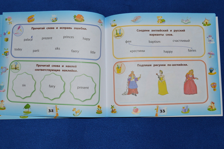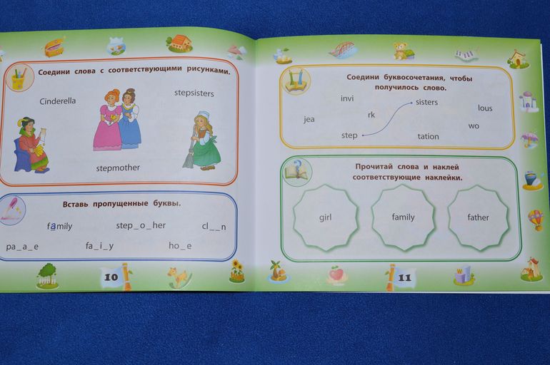 Развороты с самими сказками я не стала фотографировать ( только 1 разворот в самом верху поста), так как там все понятно ( с одной стороны картинка, с другой текст)
