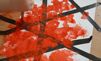 Изолентой наклеила полосок,или же прицепила листок к столу и дала ребенку кисточку и красную краску.