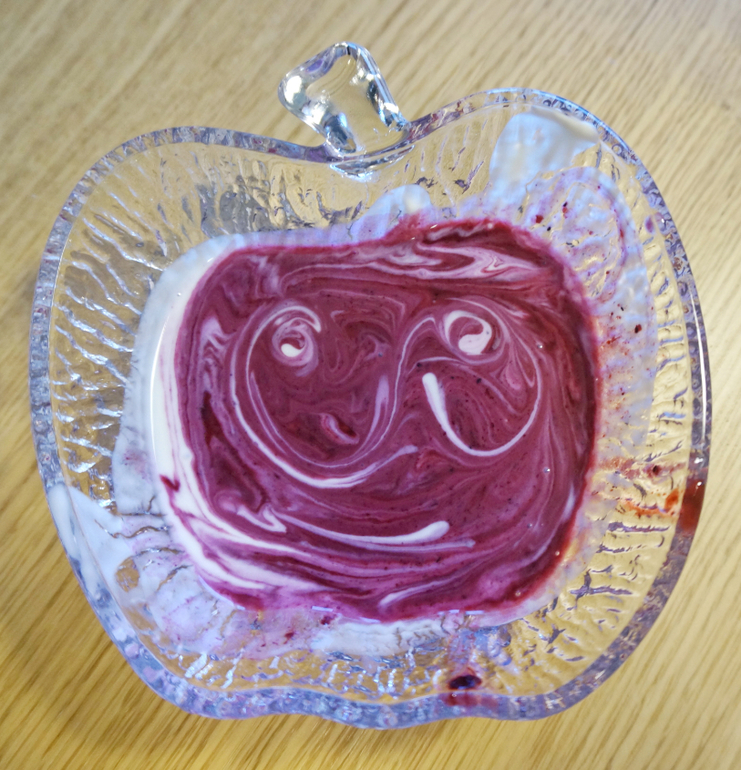 Художка ( красим, рисуем , придумываем новые способы рисовать)Многие пробуют разводы краской на молоке. У нас осталось немного ряженки после завтрака и креманочка черничного варенья. Я предложила Маше съедобный мастер-класс. На ряженку мы капали сок от варенья, а потом палочкой создавали красивые разводы. Дочка так увлекалась, что после глобального перемешивания, попросила лист бумаги и продолжила рисовать! Просто. вкусно. красиво!