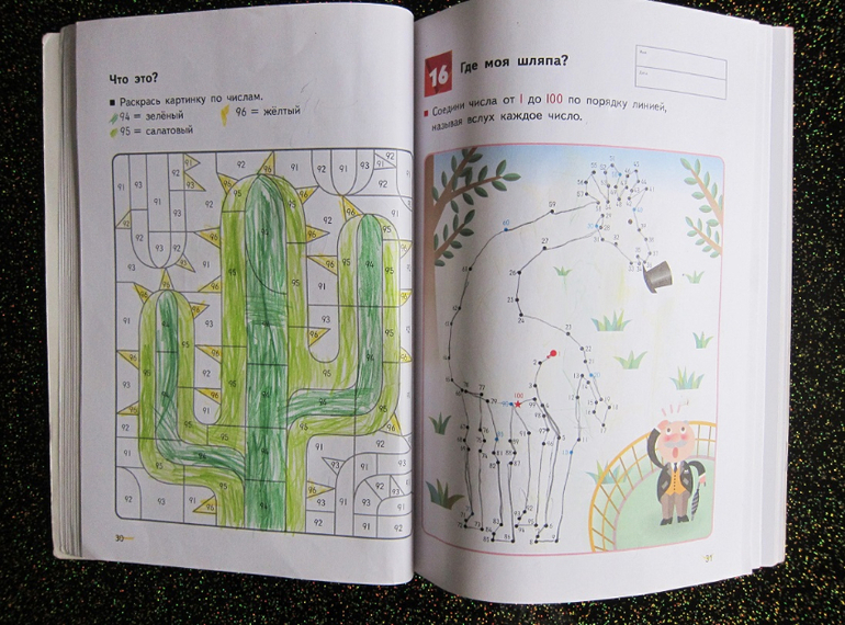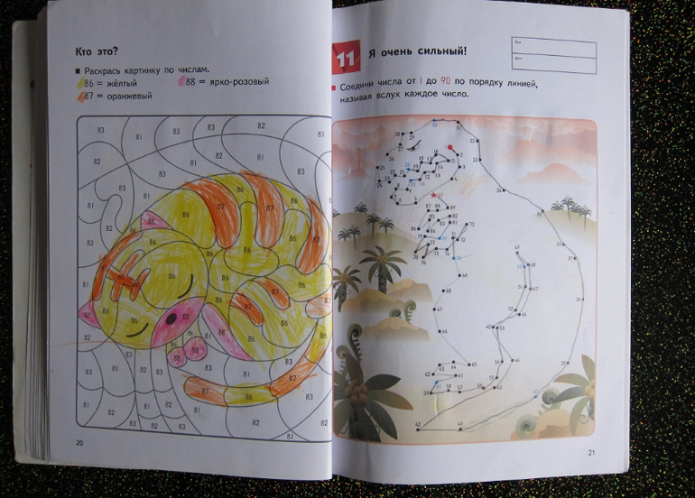 Раскраски необычны тем, что цифры в них двузначные и надо быть очень внимательным, чтобы верно выполнить задание. Например, требуется разукрасить фрагмент с цифрой 82, а на картинке несколько фрагментов под номером 62. Запутаться легко. Может быть по этой причине в пособии есть ответы, которые мне пришлось ликвидировать, когда я застала сына за подсматриванием.