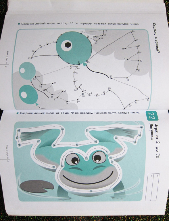 Задания "соединить по цифрам" разной сложности. Какие-то дались легко, над некоторым пришлось попотеть. Мы с сыном иногда выполняли задание вместе: он соединял десять цифр подряд, потом я десять. А несколько раз признаюсь я втихомолку от сына сама выполнила несколько "соединялок", увлекательно это дело:))