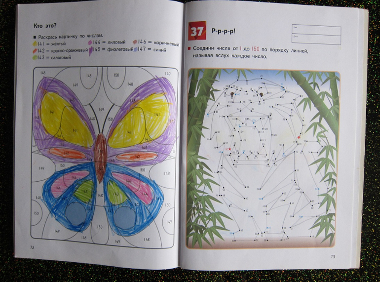 Тетрадь "Игры с числами от 1 до 150" включает в себя два вида заданий: раскраска по номерам и соединялки по цифрам.