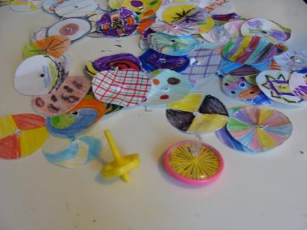Игры и игрушки от 0 до 99 (Про игры и игрушки которые подойдут и большим и маленьким)Сашу очень затянуло) Сначала мы просо проводили очередной эксперимент по смешиванию цвета. Раскрашивали круг в разные цвета и вращали на зубочистке. Не очень понравилось, т.к. на зубочистке он крутится секунду.... А потом я вспомнила, что в киндерах попадались волчки, нашли два и тут началось!!!! Саша просыпался и звал рисовать волчки, это ребенок, который вообще не любит раскраски))). В субботу темп-ра под сорок, а он просил отнести его за стол и рисовать с ним.... вот результаты нашей трехдневной деятельности. И сами волчки: