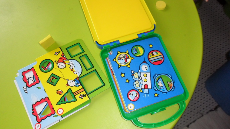 Игра хранится в коробочке, состоящей из двух частей. В одной части- 24 фигуры четырех цветов. В другой - карточки с прорезями для фигур.